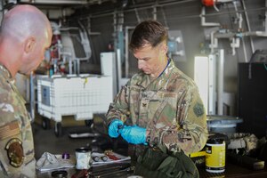 U.S. Air Force Capt. James Bradford, 909th Air Refueling Squadron aircraft commander, performs pre-flight checks in a KC-135 Stratotanker at Kadena Air Base, Japan, July 19, 2023. Kadena’s aerial refueling capabilities extend airborne training time and combat radius, ensuring U.S. and allied nation