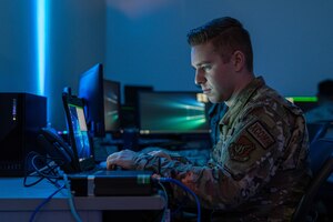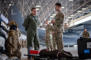 U.S. Air Force Tech. Sgt. Emmanuel Brown, right, 353rd Special Operations Aircraft Maintenance Squadron MC-130 craftsman crew chief, briefs Brig. Gen. Jesse Friedel, left, Fifth Air Force deputy commander, on their medical evacuation capabilities at Kadena Air Base, Japan, Dec. 1, 2022. The U.S. Air