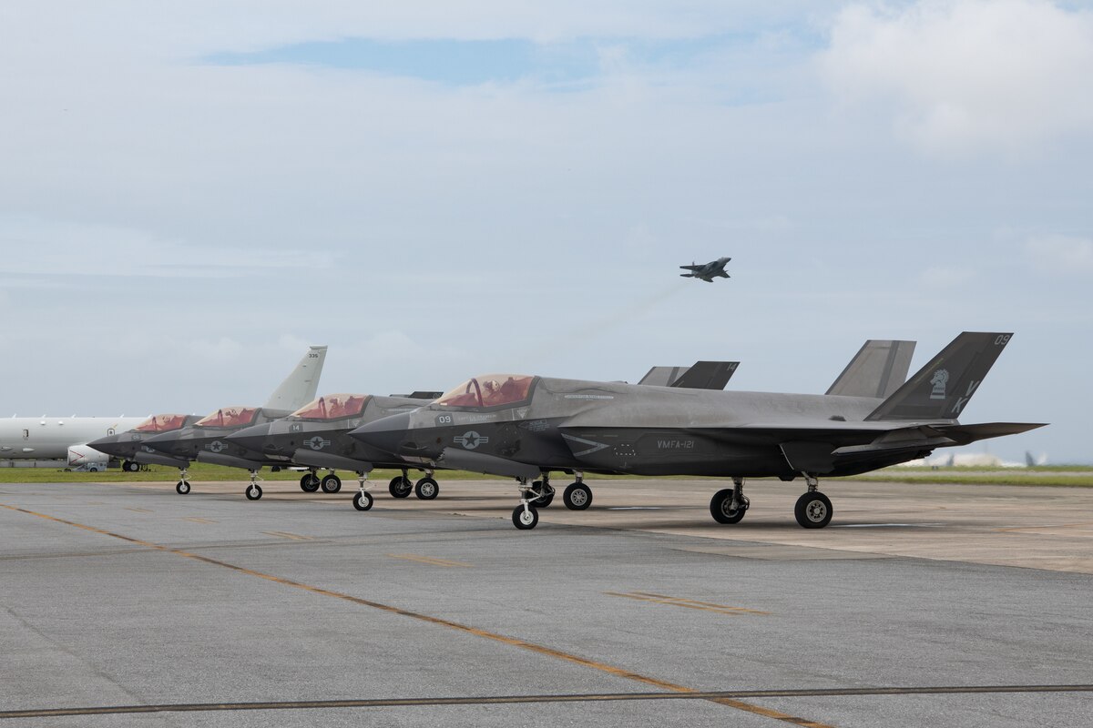 USMC, USAF hot-pit during Katana Strike Published May 5, 2023 By Airman 1st Class Tylir Meyer 18th Wing Public Affairs KADENA AIR BASE, Japan -- U.S. Marine Corps Cpl. Seth Anderson, Marine Wing Headquarters Squadron 1 power line plane captain, oversees an F-35B Lightning II conduct hot-pit refueling at Kadena Air Base, Japan, May 2, 2023. Joint training gives service members the opportunity to build trust and solve complex tactical problems together, contributing to the advancement of a more lethal and ready force. (U.S. Air Force photo by Airman 1st Class Tylir Meyer)