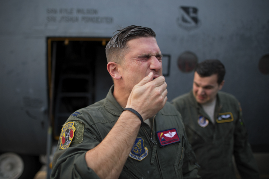 Capt. Andrew Kochman, 36th Airlift Squadron navigator, wipes his face after getting sprayed with water after completing the last active-duty C-130H tactical training sortie at Yokota Air Base, Japan, Oct. 5, 2017. "It's the fulfillment of a childhood dream, and it'll always hold a special place in my heart that most actual people will never occupy," said Kochman when asked what the H-model means to him. (U.S. Air Force photo by Yasuo Osakabe)