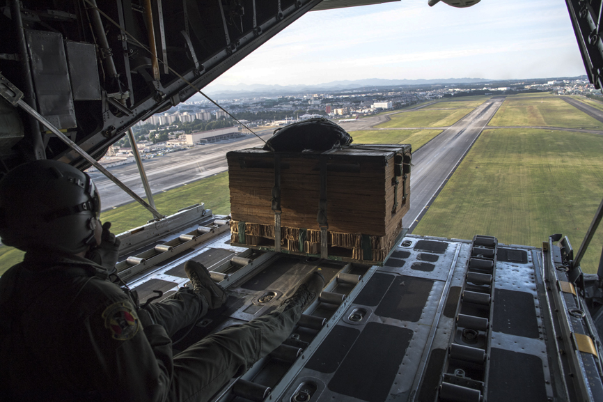 Senior Airman Gary Coe, 36th Airlift Squadron C-130H loadmaster, drops a low-cost, low-altitude bundle over Yokota Air Base, Japan, Oct. 5, 2017. This is the last time active duty C-130H Hercules' crew members perform an LCLA airdrop. (U.S. Air Force photo by Yasuo Osakabe)