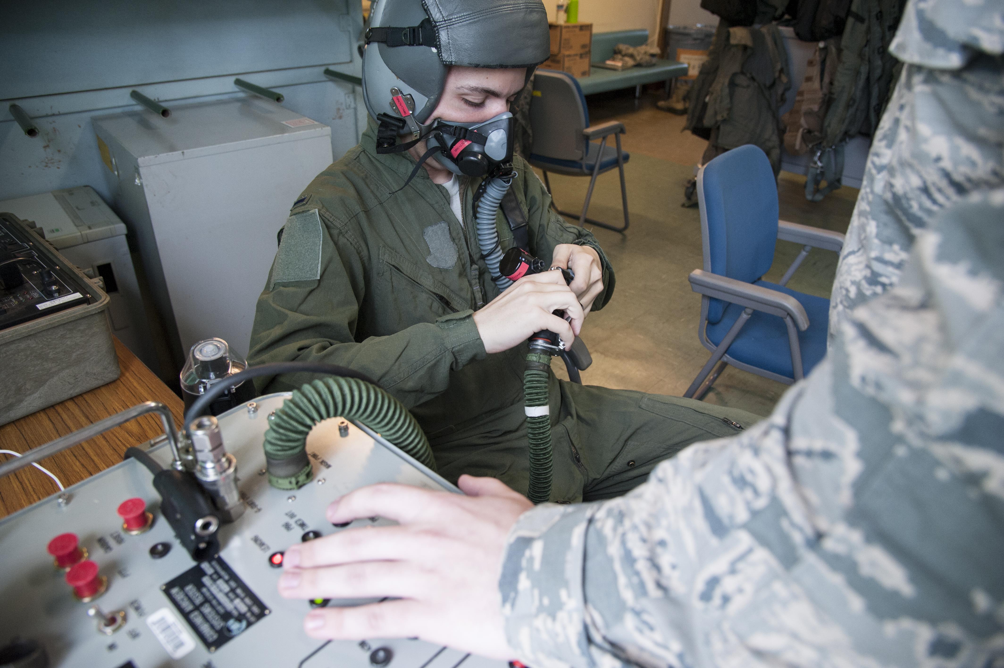 U.S. Air Force Staff Sgt. Dylan Wyant 35th Fighter Wing, information security systems officer, connects an oxygen mask to a combined aircrew system tester during the initial preparation for an F-16 Fighting Falcon familiarization flight at Tsuiki Air Base, Japan, Oct. 2, 2017. Four Airmen were chosen to receive familiarization flights in order to show them how their individual career fields contribute to accomplishing the 13th Fighter Squadron's mission. Security forces, aircrew flight equipment, communications and maintenance Airmen were selected for these familiarization flights. (U.S. Air Force photo by Staff Sgt. Melanie A. Hutto)