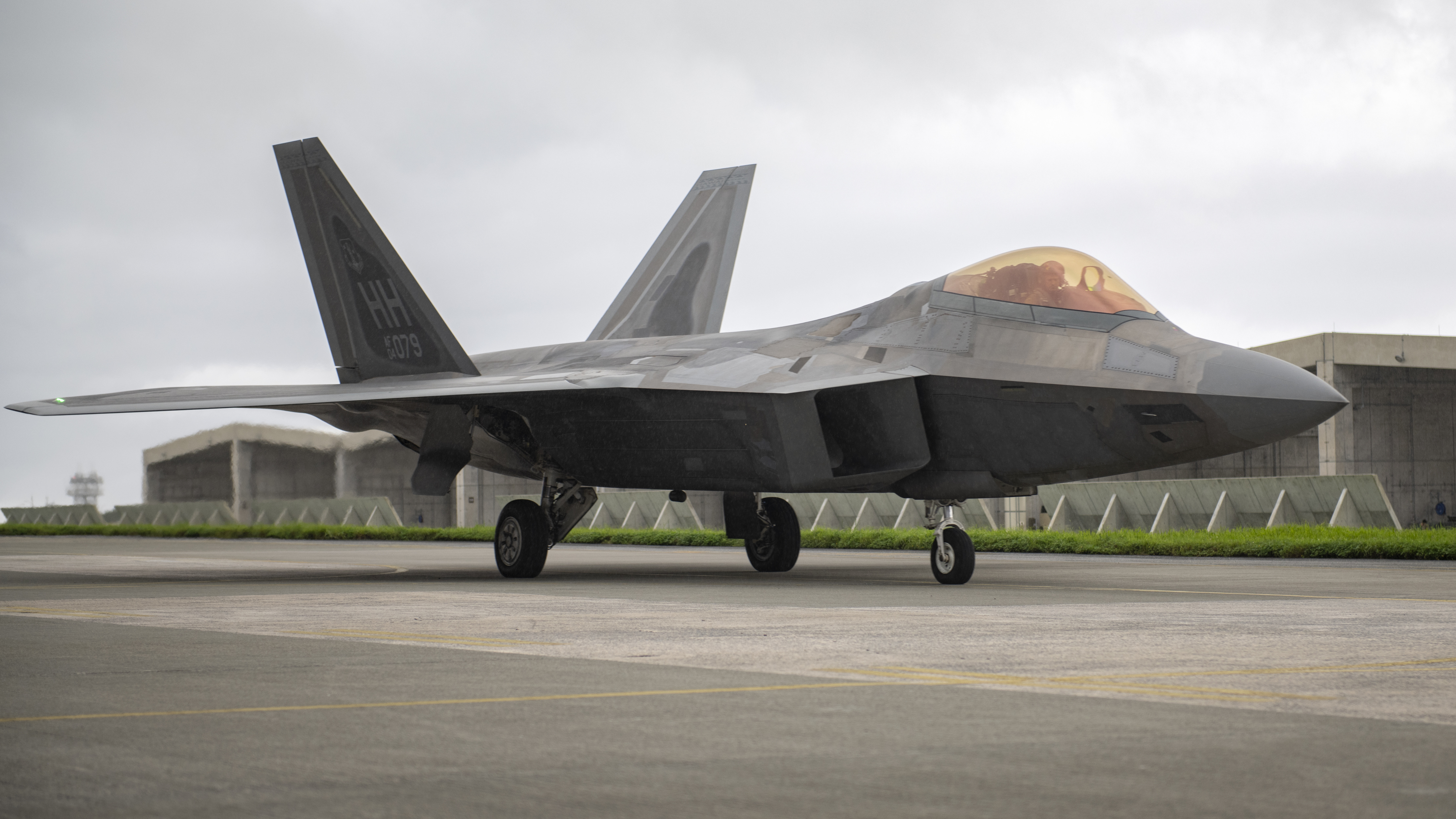 A U.S. Air Force F-22 Raptor assigned to the 199th Fighter Squadron taxis down the flightline at Kadena Air Base, Japan, June 6, 2022. Generating sorties out of Kadena allows the 199th FS to build experience operating in the physically vast and strategically complex environment of the Pacific, enabling improved readiness and interoperability. (U.S. Air Force photo by Senior Airman Jessi Monte)