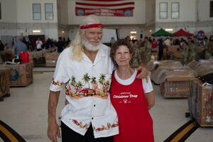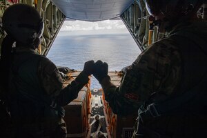 (Left to right) U.S. Air Force Staff Sgt. Kembria Mims, 36th Expeditionary Airlift Squadron aviation resource manager, and Airman 1st Class Conner Pingleton, 36th EAS C-130J loadmaster, exchange a fist bump before conducting low-cost, low-altitude bundle drops over Tamatam island, Chuuk State,